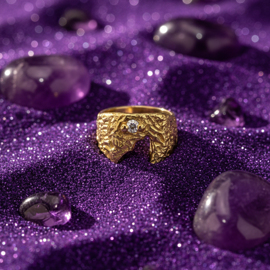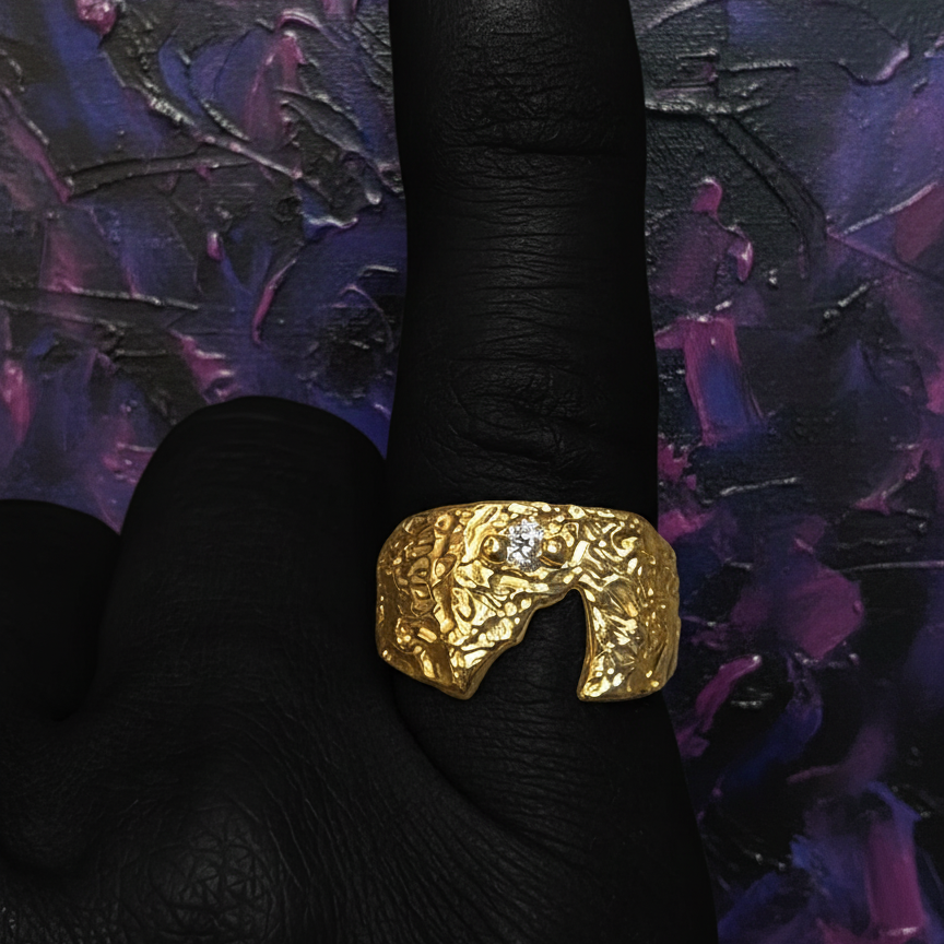 The "R02: Stellar Rupture" ring is a relic of cosmic trauma. Its heavily textured gold plated silver shell resembles a meteor's hardened crust, but its defining feature is the raw, uneven fissure that cuts the band. A single, brilliant Cubic zirconia remains, an undeniable remnant of the core energy that once resided within.