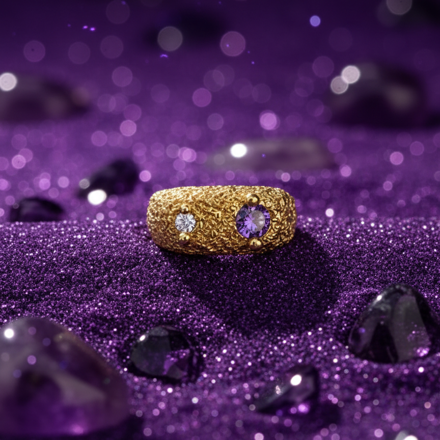 Inspired by the rare alignment of a binary star system, the R08: Binary Eclipse features a rugged, cratered gold surface that mimics the topography of an uncharted moon. A brilliant violet "primary" sun sits alongside its smaller, icy white companion, capturing the balanced gravity of deep space.