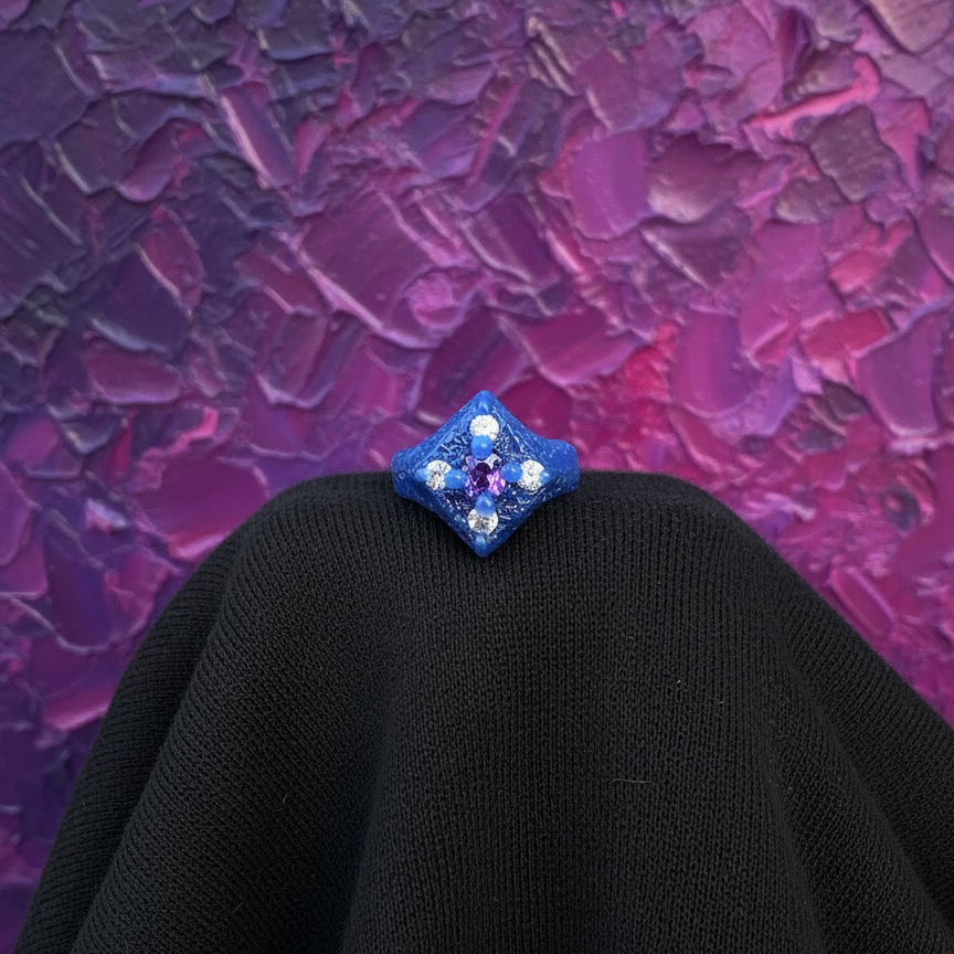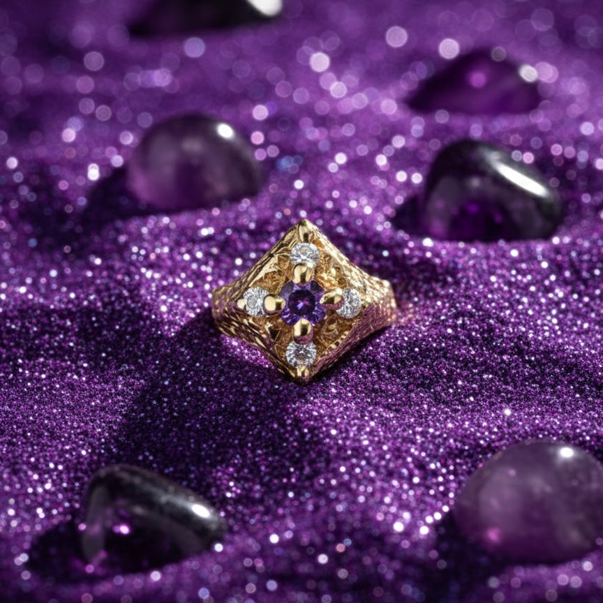 Unearthed from the glittering sands of the Xenon-IV dunes, this relic displays the unmistakable craftsmanship of a lost civilization. The textured gold mimics the volcanic crust of the planet, while the violet gemstone is rumored to be a fossilized fragment of their atmosphere. A bold statement piece for those who belong to more than one world.