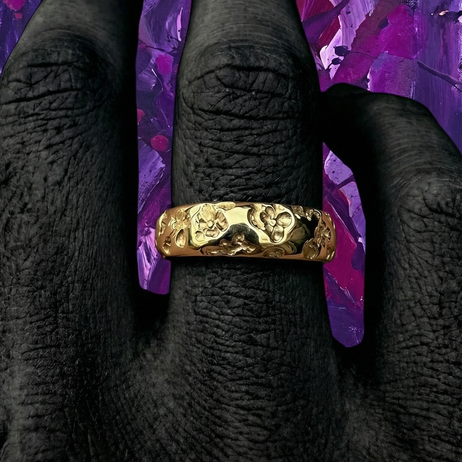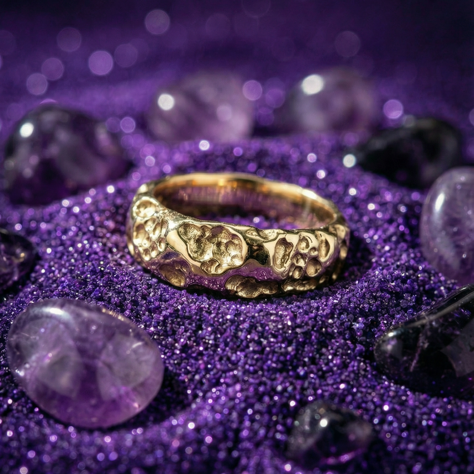 The "R10: The Pitted Core" ring is pure, elemental force. The wide band is rendered with a deeply textured surface, a chaotic landscape of craters and molten rivulets. There are no gems, only the dense, self-contained power of its material, echoing the raw, unrefined metal of a cosmic body's beginnings.