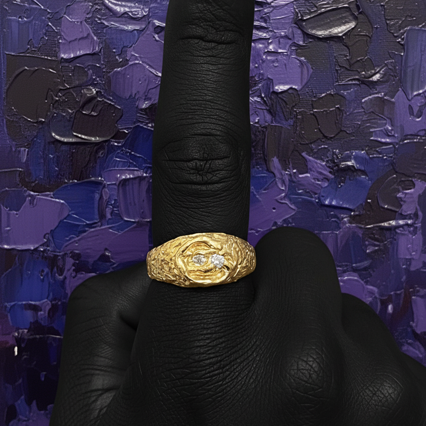The "R01: Alien Egg" ring is an unparalleled artifact. Cast in rich, heavily textured silver and then plated in gold. it features two cubic zirconia that gleam like the watchful eyes of a dormant sentinel.